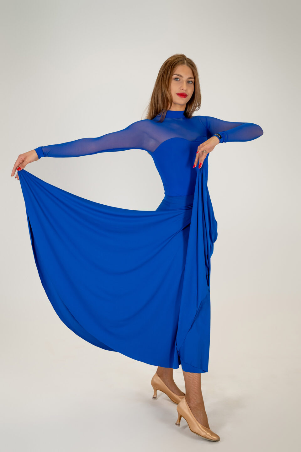 Der Body Agnes besteht aus hochwertigster englischer Lycra, kombiniert mit englischem Stretch-Mesh. Das Material ist leicht und atmungsaktiv. Dank der speziell geformten Ärmel betont der Body perfekt die Haltung jeder Tänzerin.