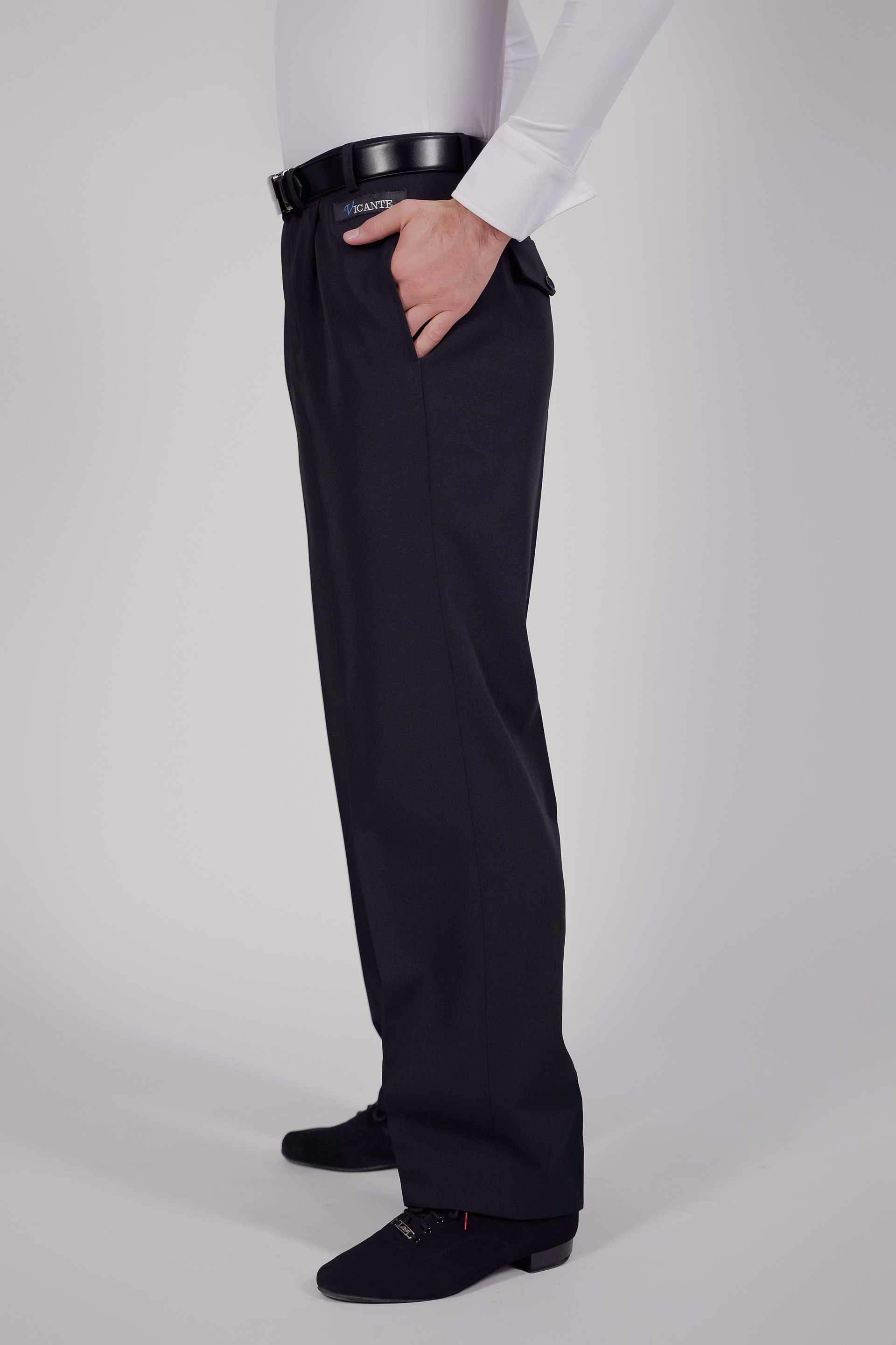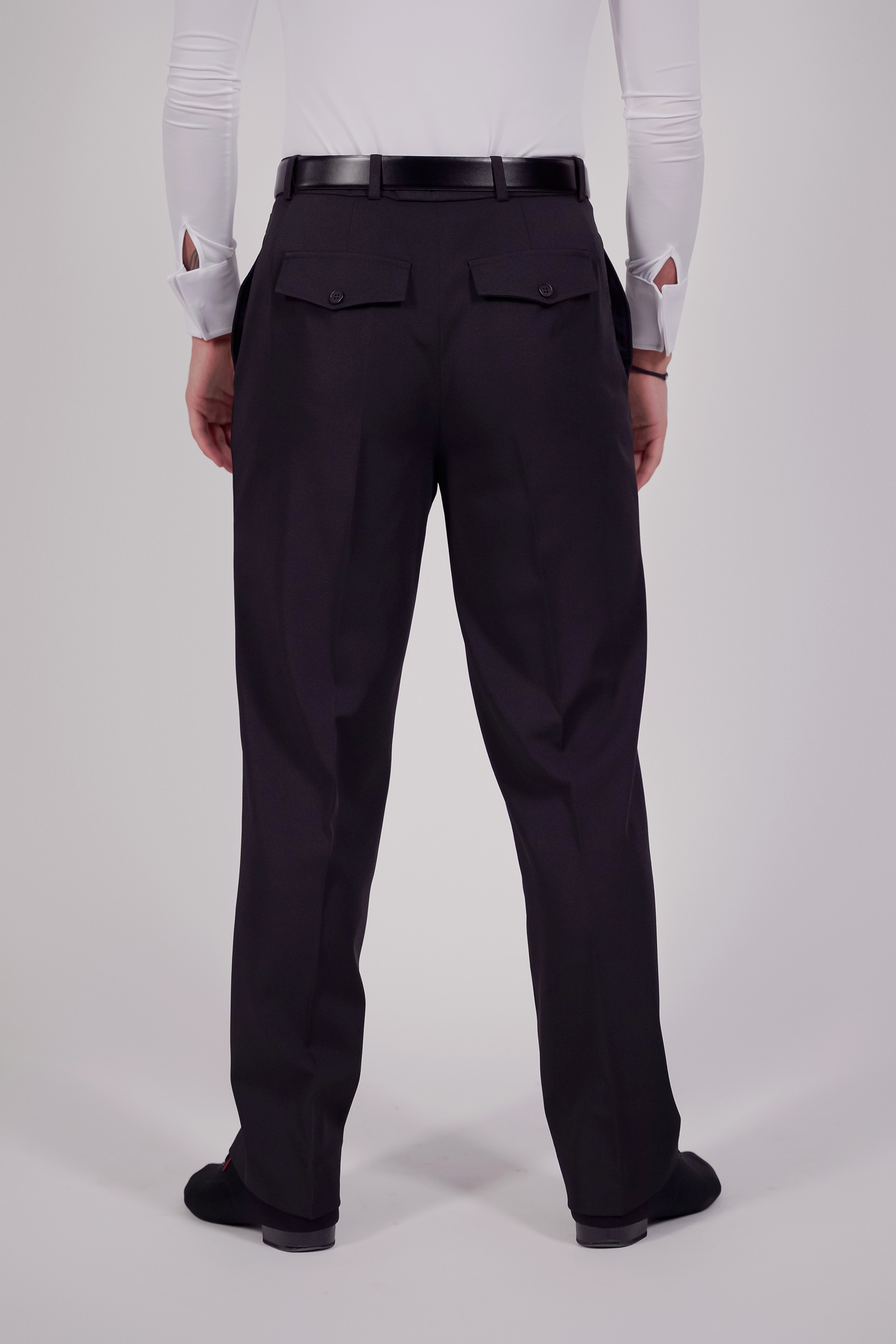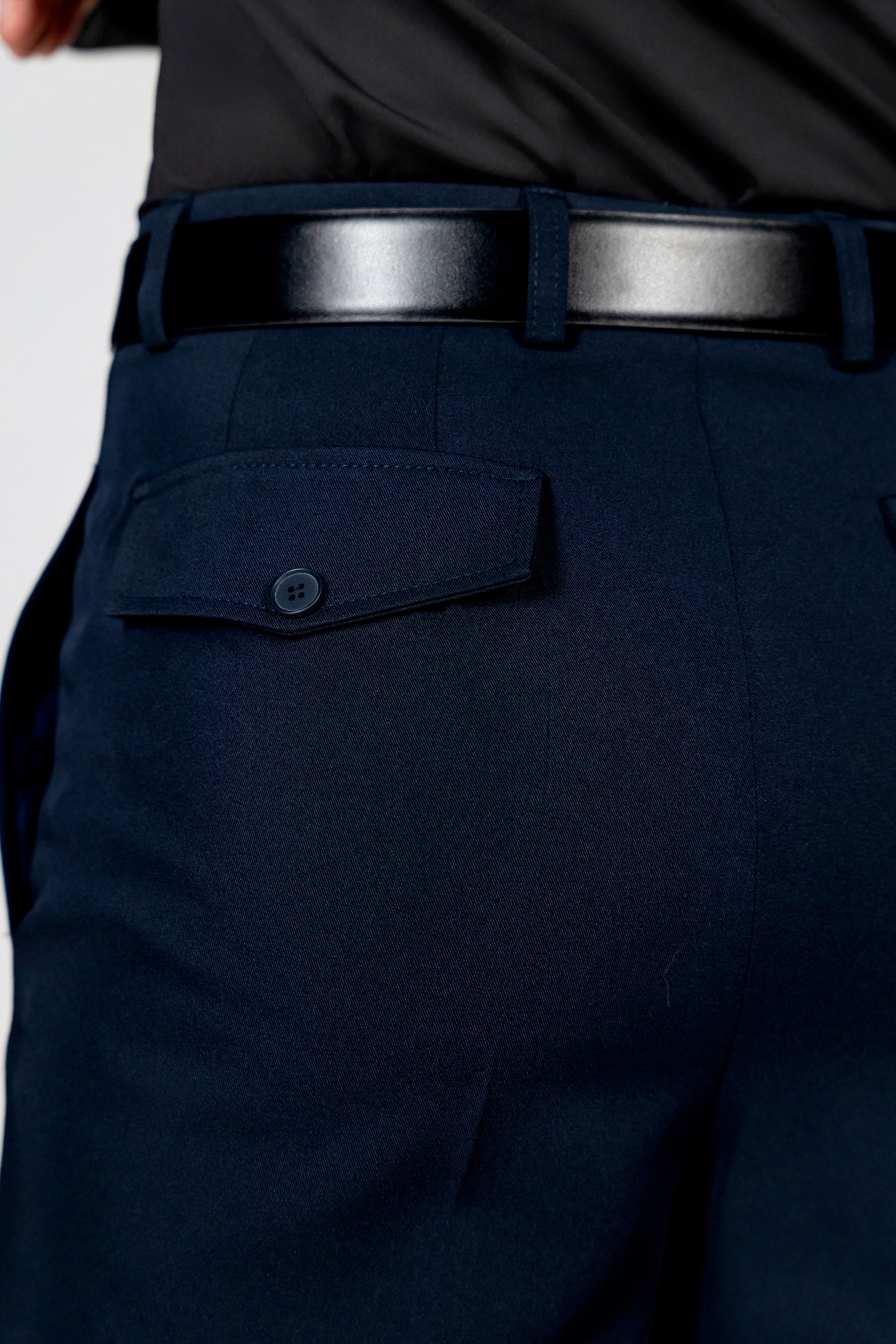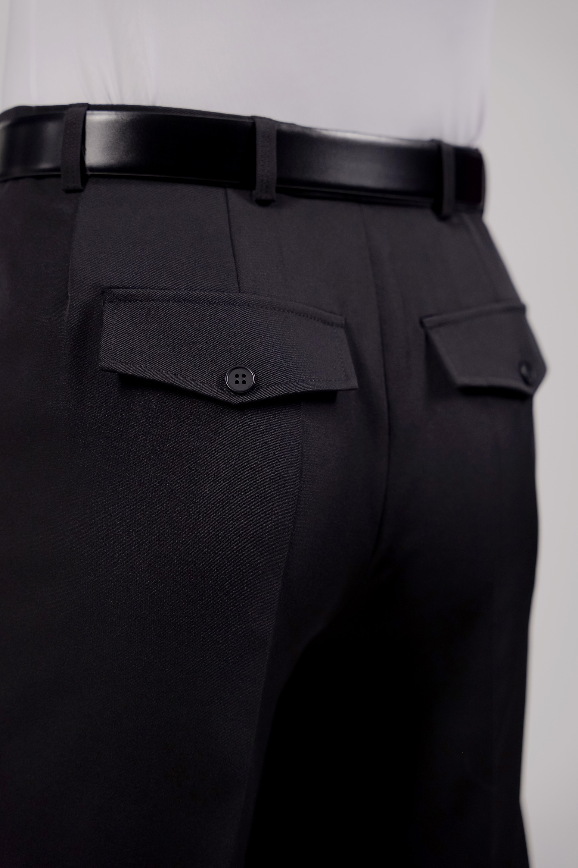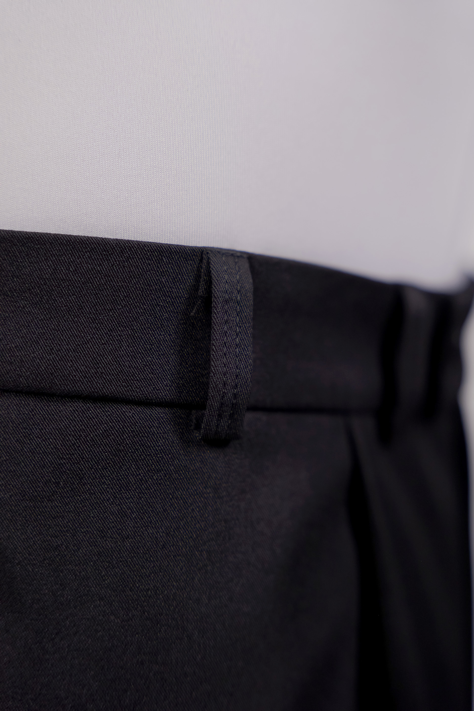 Hose mit Gürtelschlaufen aus hochwertigem Stoff in tiefem, intensivem Schwarz. Die Hose hat einen Anzugsschnitt, einen Bund auf Hüfthöhe und schmale, stärker taillierte Beine. Eine einzelne Falte auf Hüfthöhe. Dank der speziellen Eigenschaften der Fasern ist die Hose knitterfrei. Das Produkt wird dem Kunden in maximaler Länge geliefert – zur individuellen Kürzung. Beim Kauf in unserem stationären Geschäft besteht die Möglichkeit einer kostenlosen Kürzung. Ein spezieller, verdeckter Nahtzug im hinteren Teil der Hose ermöglicht ein einfaches Verengen oder Erweitern.