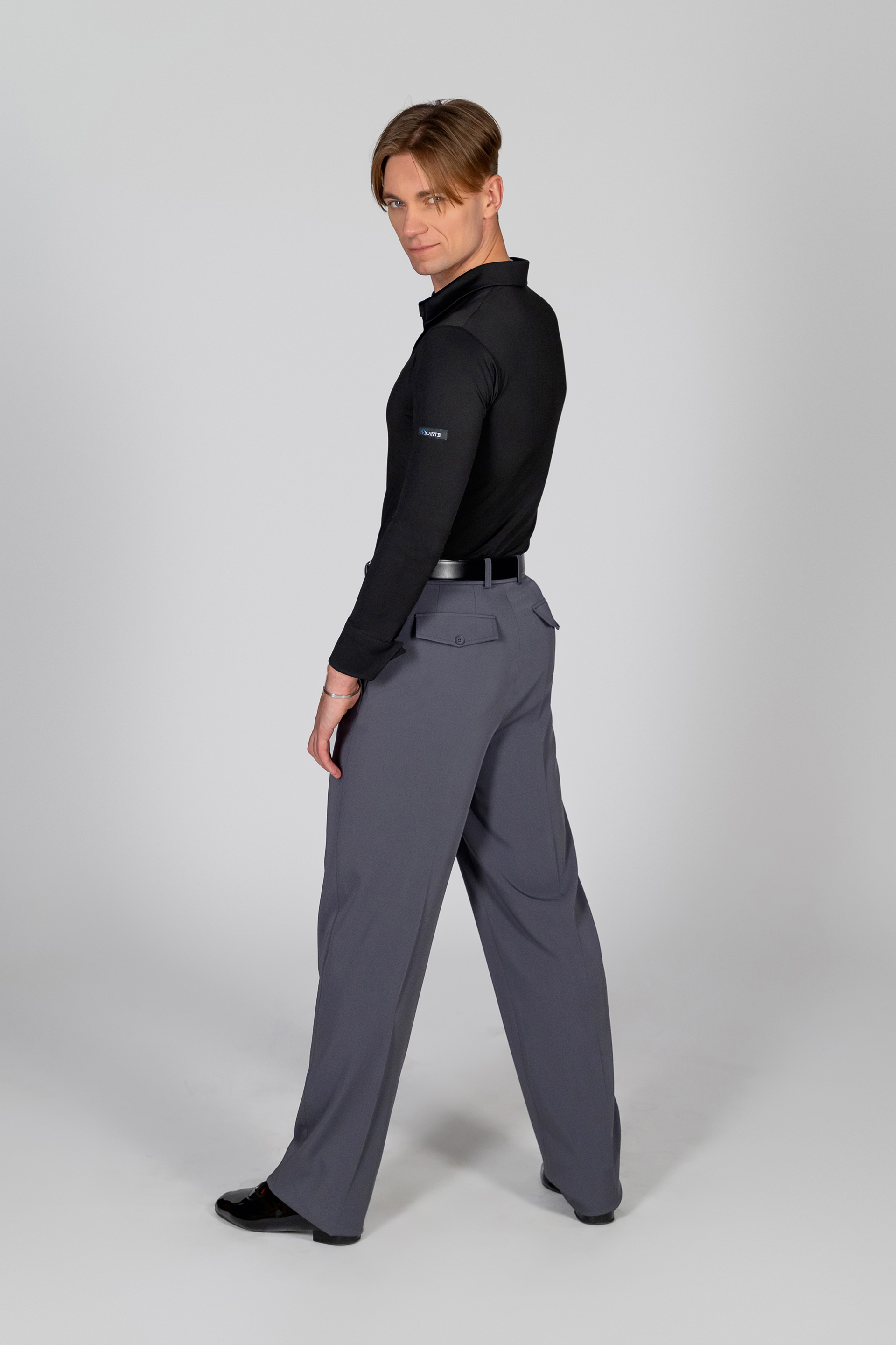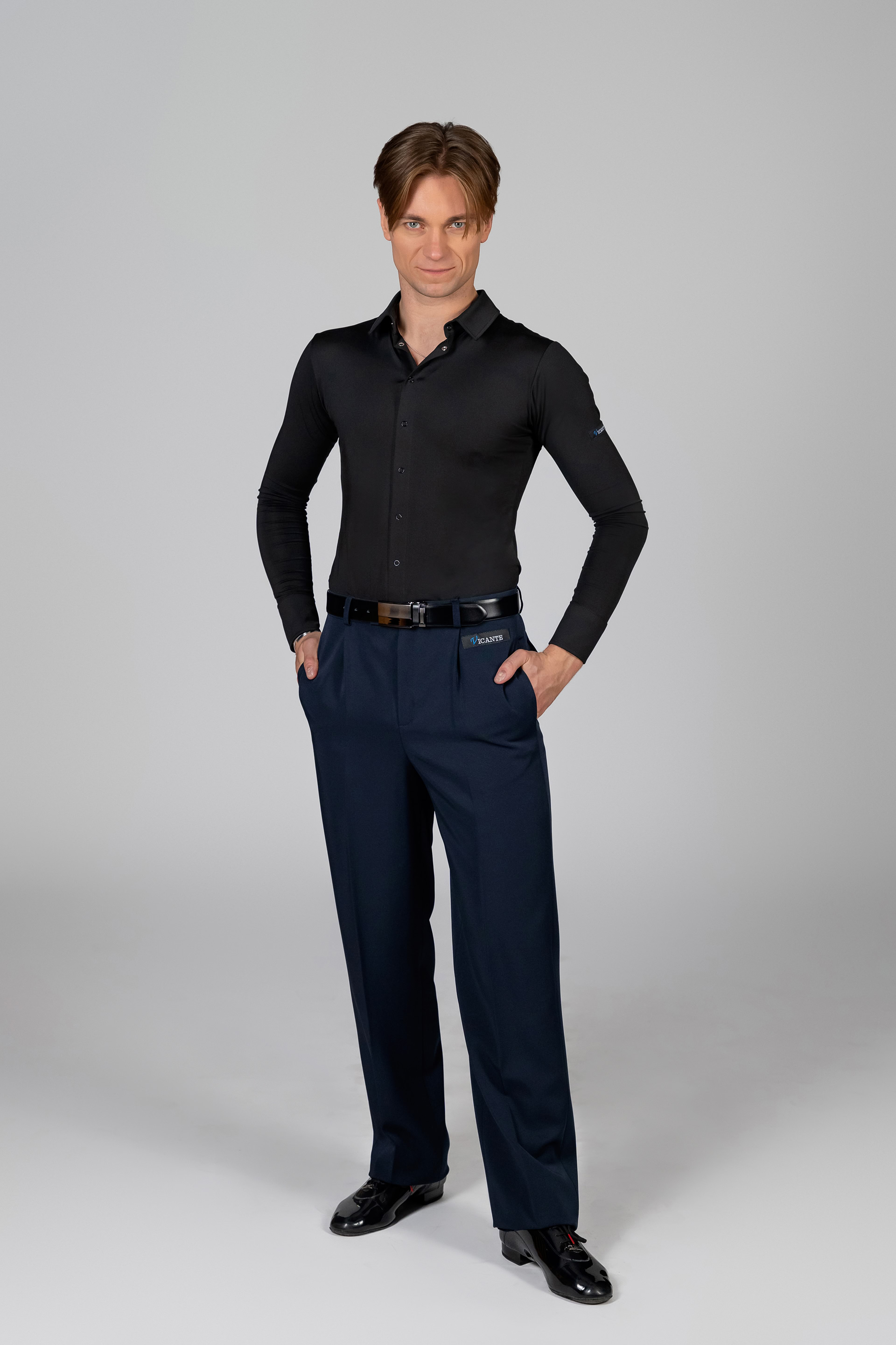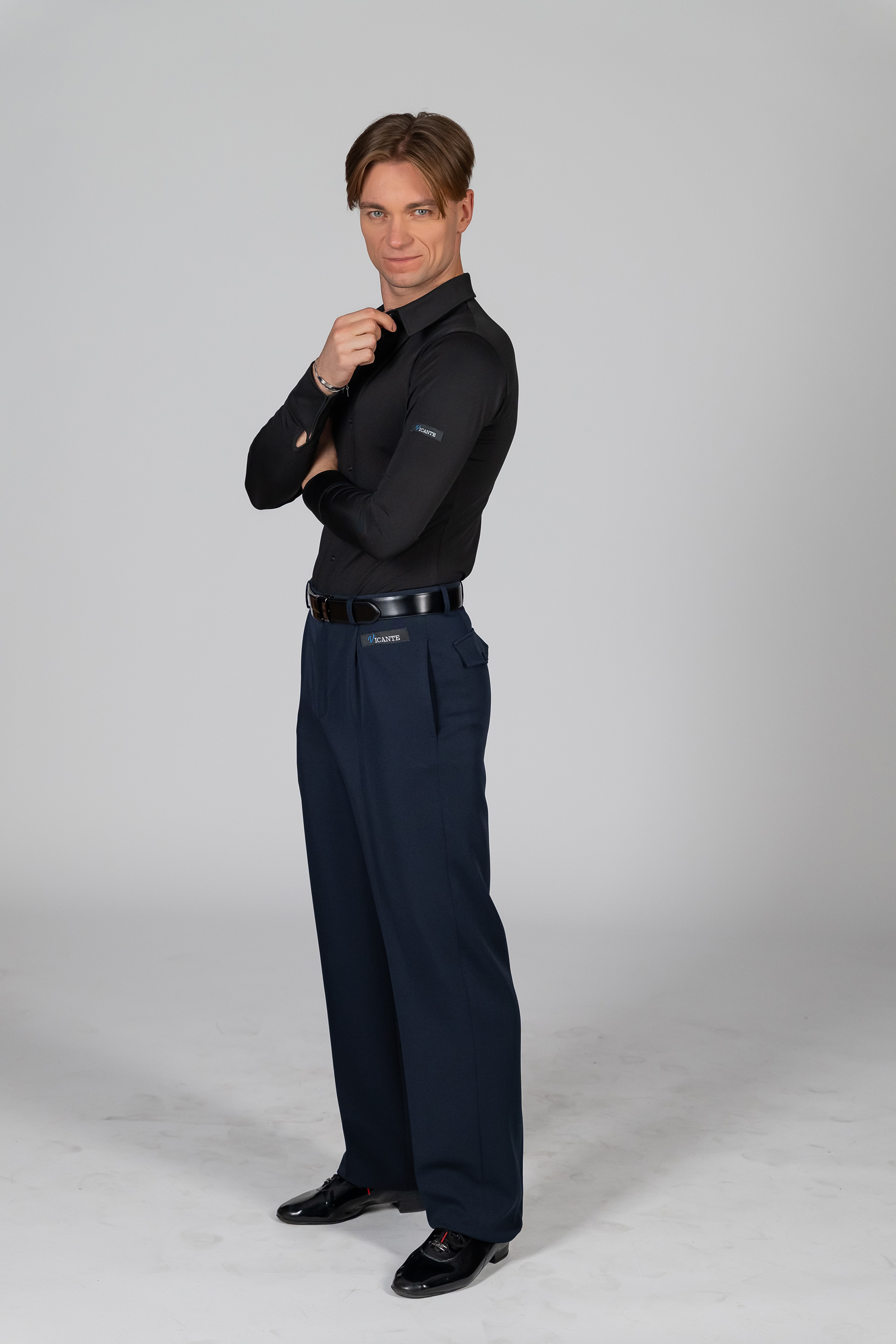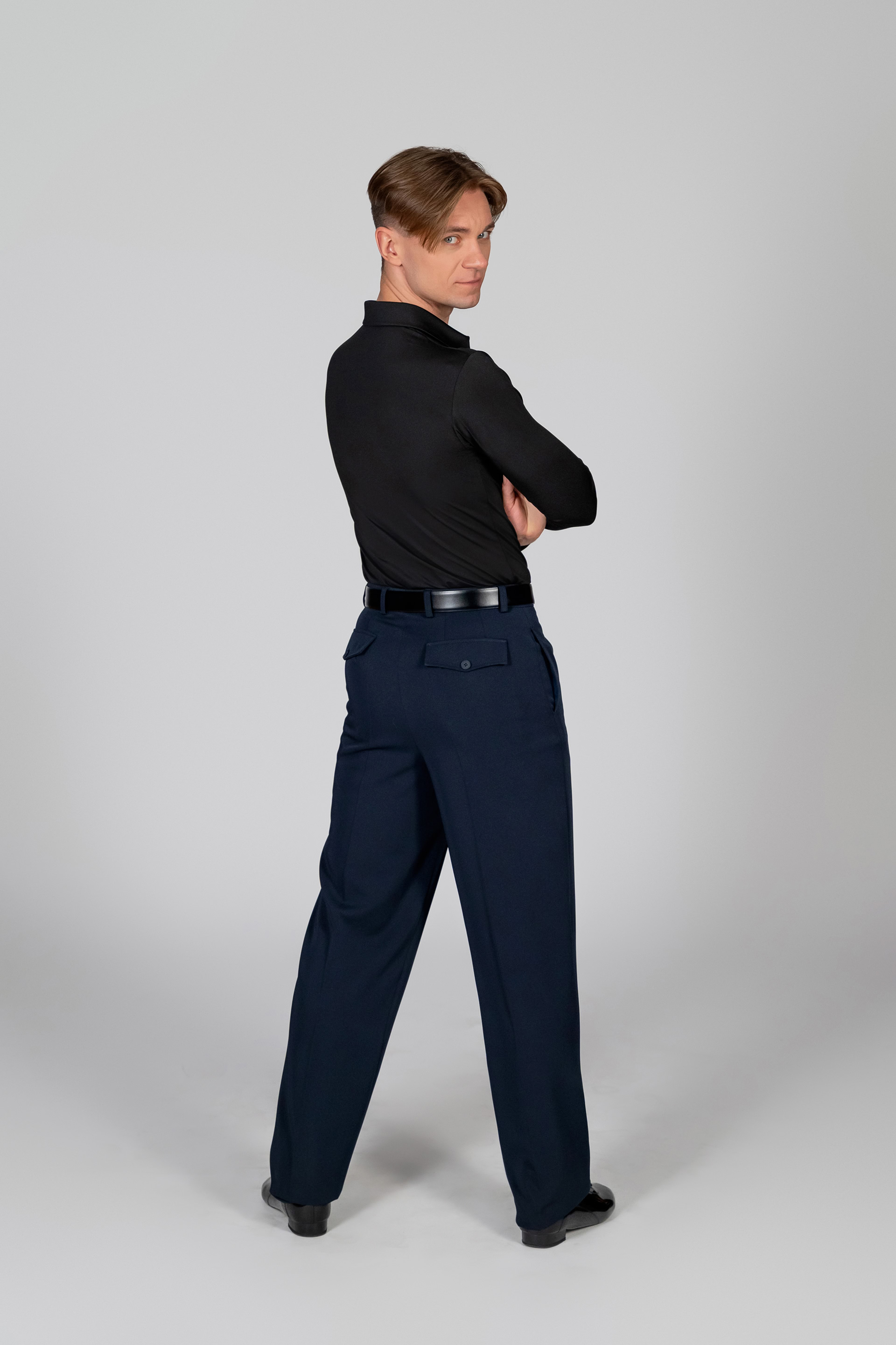 Hose mit Gürtelschlaufen aus hochwertigem Stoff in tiefem, intensivem Schwarz. Die Hose hat einen Anzugsschnitt, einen Bund auf Hüfthöhe und schmale, stärker taillierte Beine. Eine einzelne Falte auf Hüfthöhe. Dank der speziellen Eigenschaften der Fasern ist die Hose knitterfrei. Das Produkt wird dem Kunden in maximaler Länge geliefert – zur individuellen Kürzung. Beim Kauf in unserem stationären Geschäft besteht die Möglichkeit einer kostenlosen Kürzung. Ein spezieller, verdeckter Nahtzug im hinteren Teil der Hose ermöglicht ein einfaches Verengen oder Erweitern.