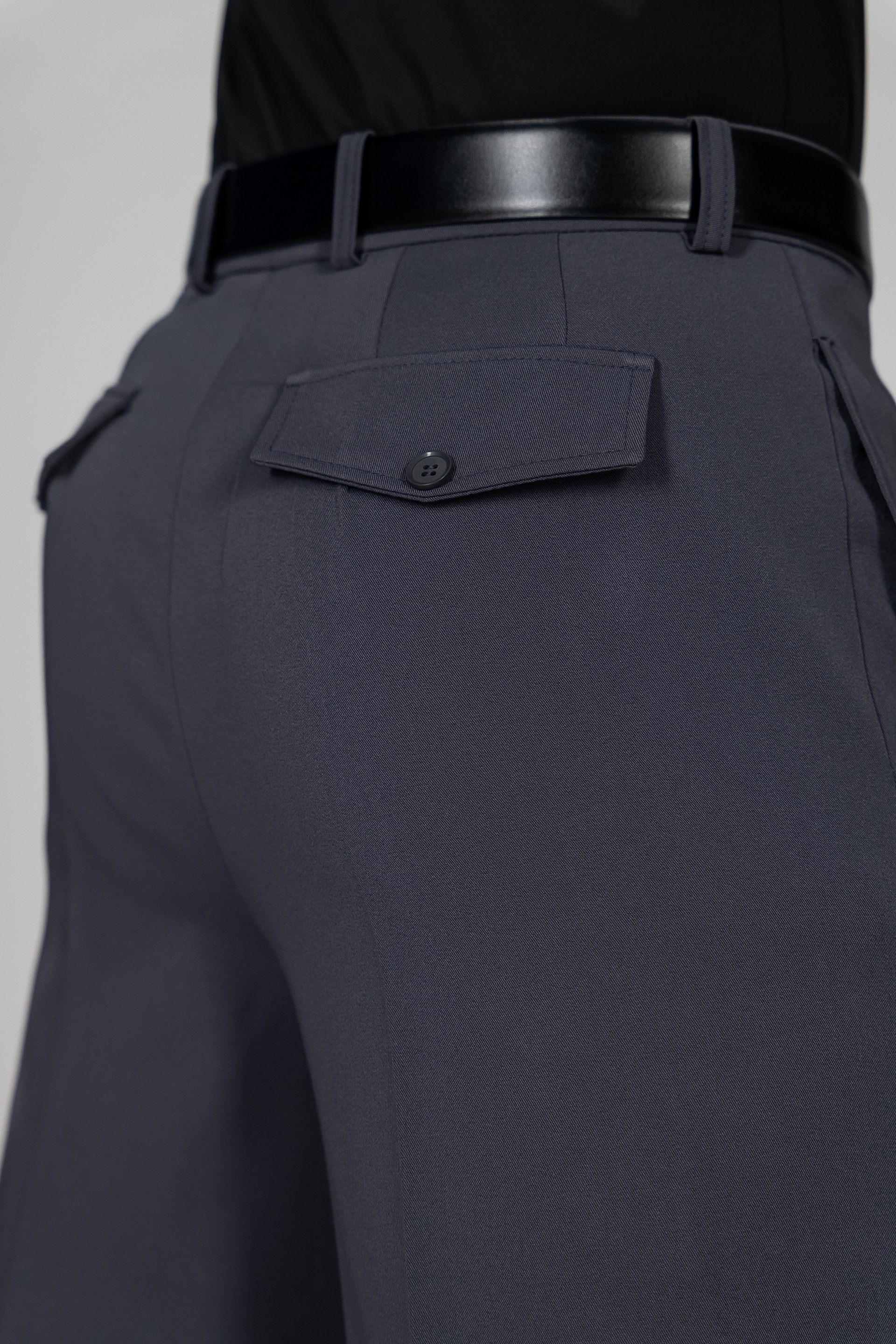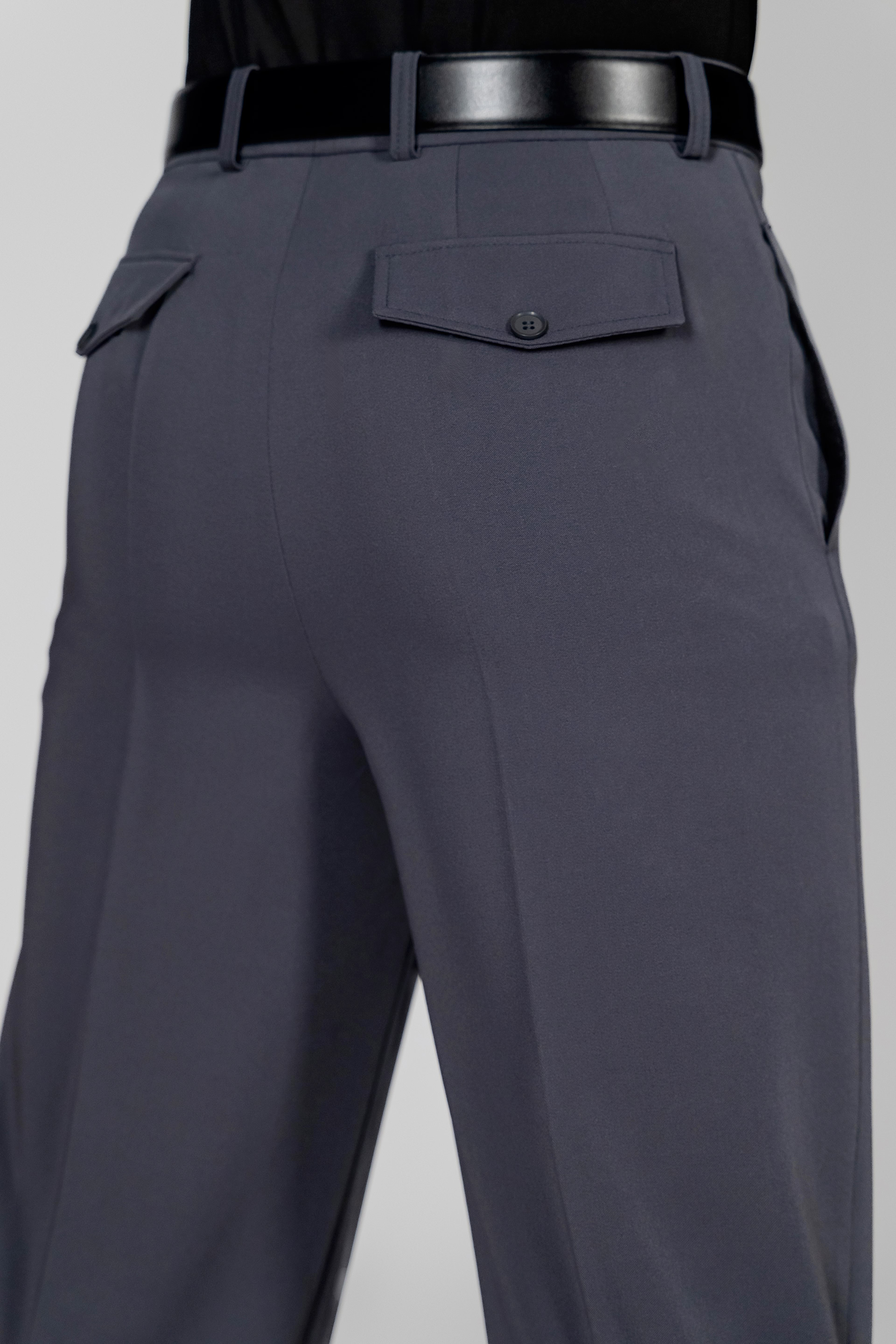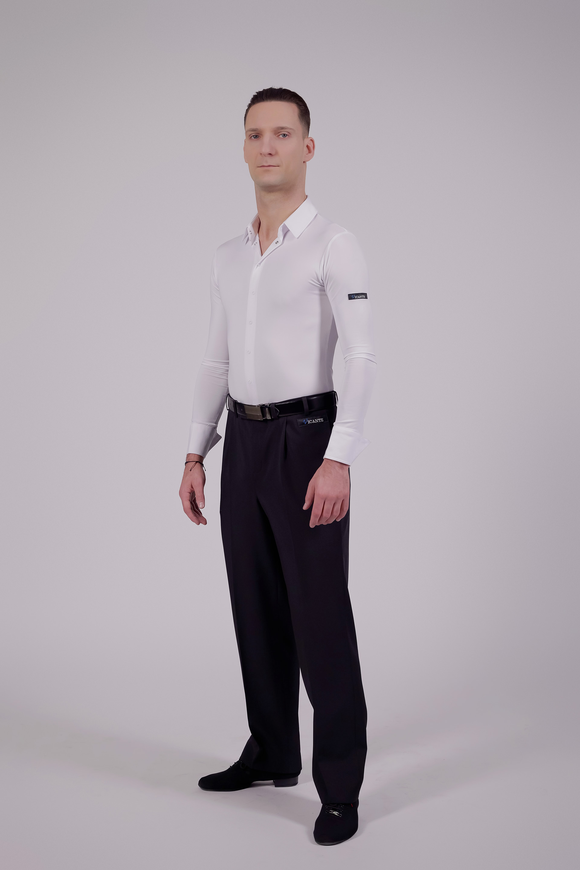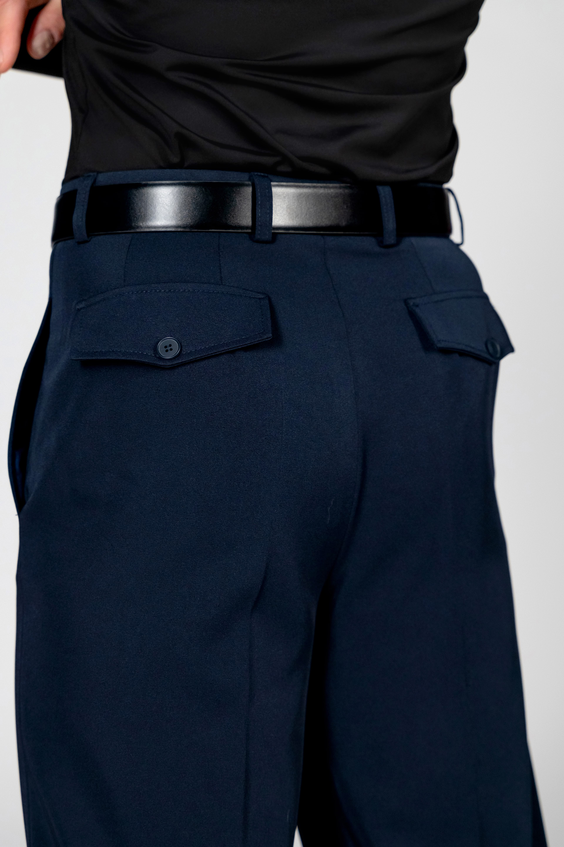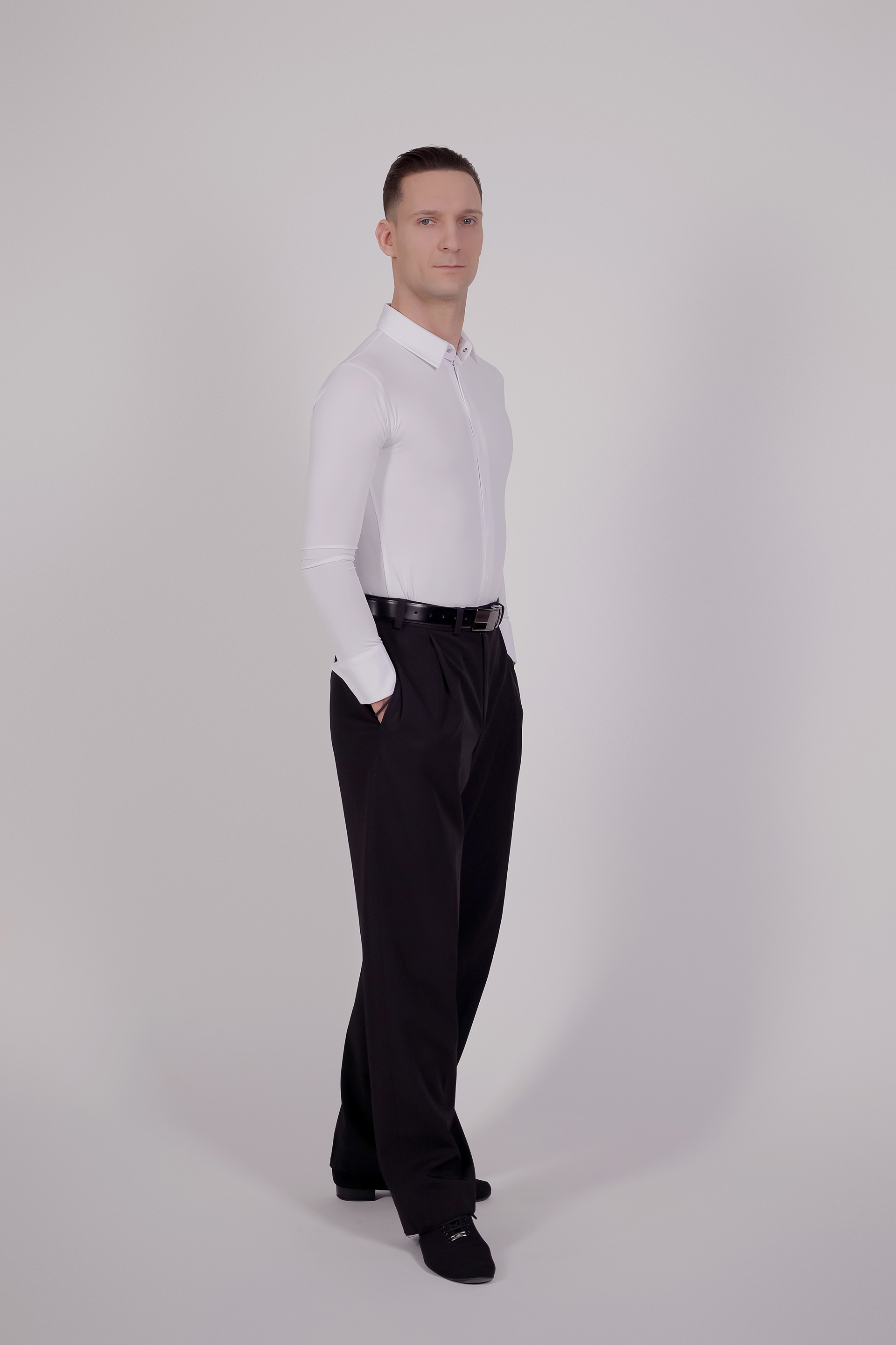 Hose mit Gürtelschlaufen aus hochwertigem Stoff in tiefem, intensivem Schwarz. Die Hose hat einen Anzugsschnitt, einen Bund auf Hüfthöhe und schmale, stärker taillierte Beine. Eine einzelne Falte auf Hüfthöhe. Dank der speziellen Eigenschaften der Fasern ist die Hose knitterfrei. Das Produkt wird dem Kunden in maximaler Länge geliefert – zur individuellen Kürzung. Beim Kauf in unserem stationären Geschäft besteht die Möglichkeit einer kostenlosen Kürzung. Ein spezieller, verdeckter Nahtzug im hinteren Teil der Hose ermöglicht ein einfaches Verengen oder Erweitern.